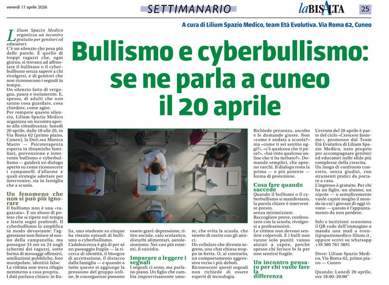 Per rompere questo silenzio, Lilium Spazio Medico organizza un incontro aperto alla cittadinanza: lunedì 20 aprile, dalle 18 alle 20, in Via Roma 62 (primo piano, Cuneo), la Dott.ssa Monica Marro — Psicoterapeuta esperta in dinamiche familiari, prevenzione e intervento bullismo e cyberbullismo — guiderà un dialogo aperto su come riconoscere i campanelli d’allarme e quali strategie adottare per intervenire, sia in famiglia che a scuola.