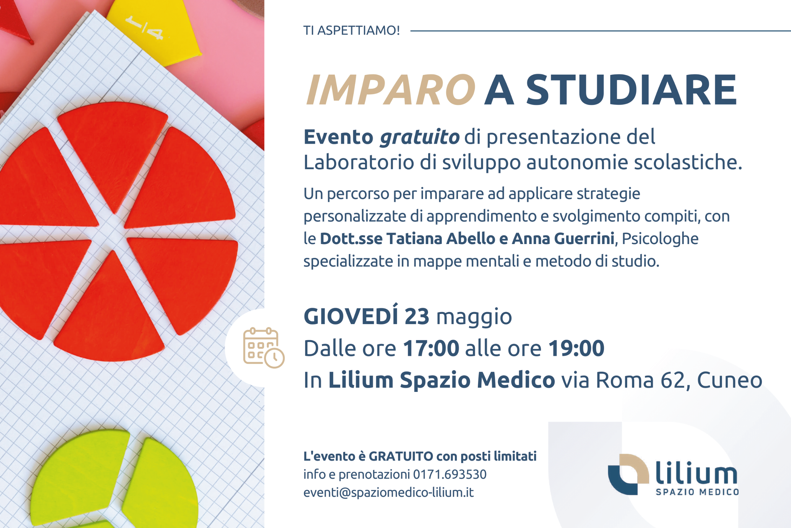 Ma come? Ne parliamo con il team del Percorso DSA e metodi di studio Lilium, GIOVEDì 23 MAGGIO ALLE ORE 17.00 in via Roma 62 presso Lilium Spazio Medico. L’evento è gratuito, aperto a educatori, insegnanti, genitori, nonni e tutti coloro che hanno a cuore l’educazione di bambini e ragazzi delle scuole elementari e medie. Per prenotarsi: eventi@spaziomedico-lilium.it