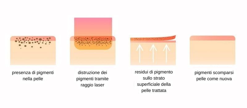 Tali apparecchiature lavorano sia a nanosecondi che a picosecondi, permettendo di vaporizzare in piccolissimi frammenti i pigmenti di colore che compongono la matrice del tatuaggio da eliminare che verrà frantumato, di seduta in seduta, e smaltito gradualmente dal nostro organismo.