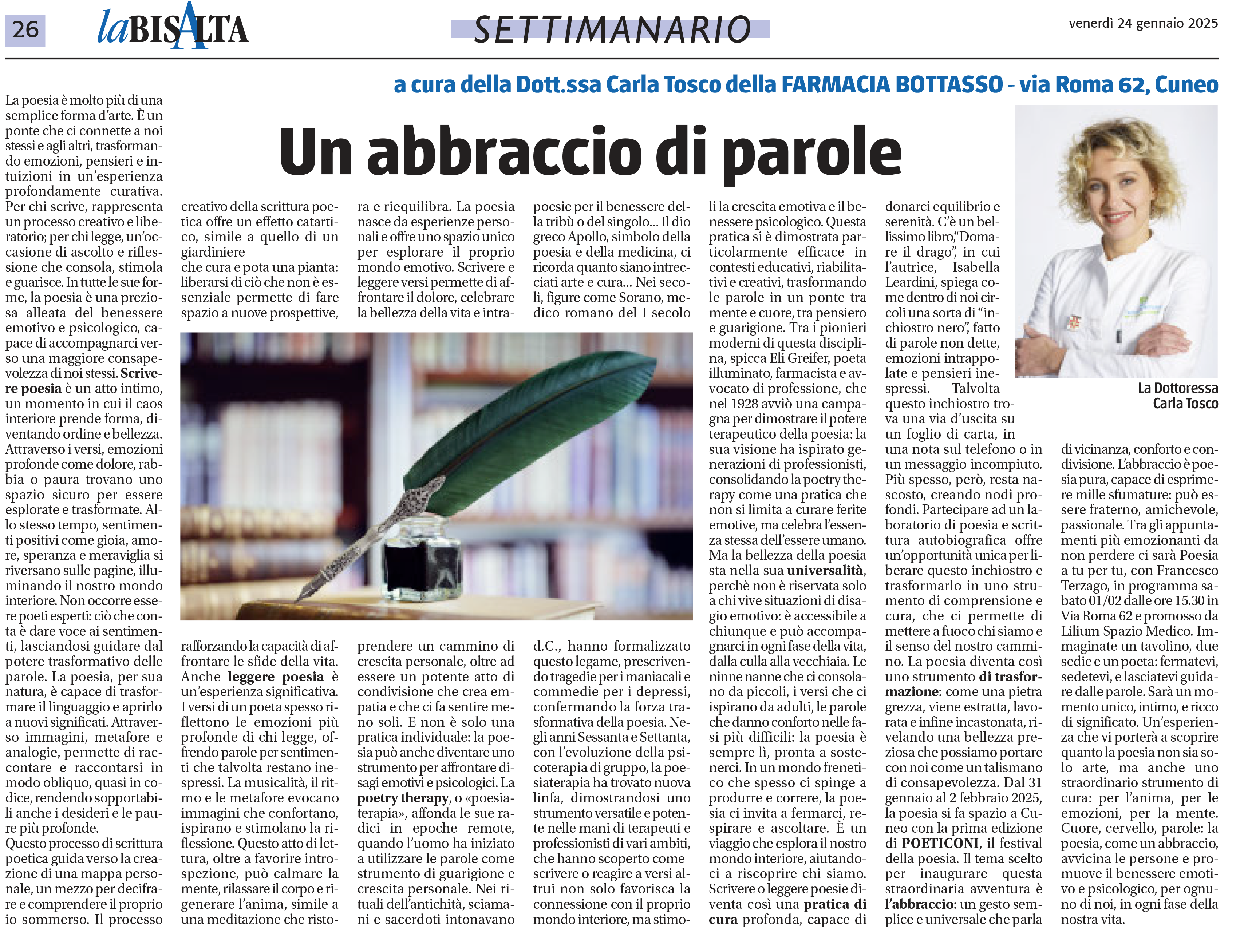 Dal 31 gennaio al 2 febbraio 2025, la poesia si fa spazio a Cuneo con la prima edizione di POETICONI, il festival della poesia. Il tema scelto per inaugurare questa straordinaria avventura è l’abbraccio: un gesto semplice e universale che parla di vicinanza, conforto e condivisione.